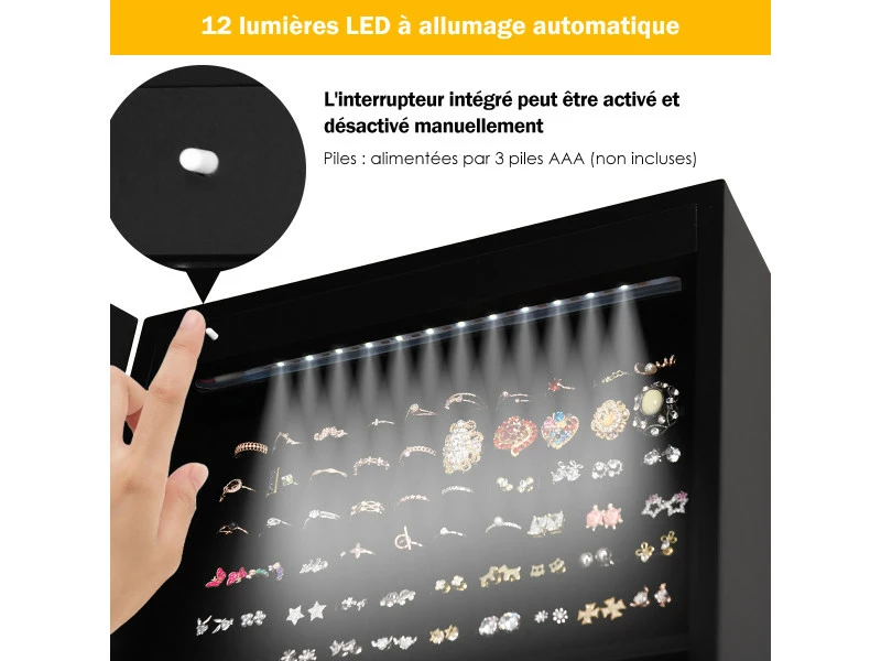 - 【Doublure intérieure en velours et douze lampes LED:】 l’intérieur de l’armoire est doublé de velours doux pour permettre de réduire les rayures sur les bijoux ainsi que l’oxydation par l’air. De plus, 12 lumières LED intégrées (alimentées par 3 piles AAA non incluses) facilitent l’association des bijoux en cas de faible luminosité.