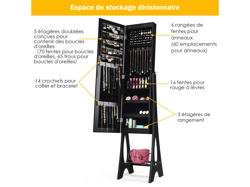 - 40 emplacements pour bagues, 16 emplacements pour rouges à lèvres, 4 étagères, 7 crochets pour colliers, 28 emplacements pour boucles d’oreilles et 39 orifices pour boucles d’oreilles pour organiser et ranger efficacement