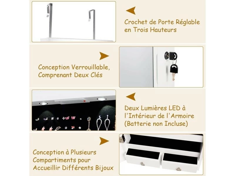 - Éclairage LED intégré: Cette armoire à bijoux a des lumières LED à l’intérieur, vous n’avez donc pas besoin d’autres choses pour éclairer dans l’obscurité. Notre armoire vous permet d’essayer des vêtements et des bijoux sous une lumière douce, ce qui est une partie essentielle de votre vie délicate.