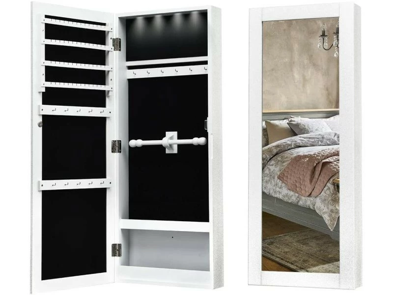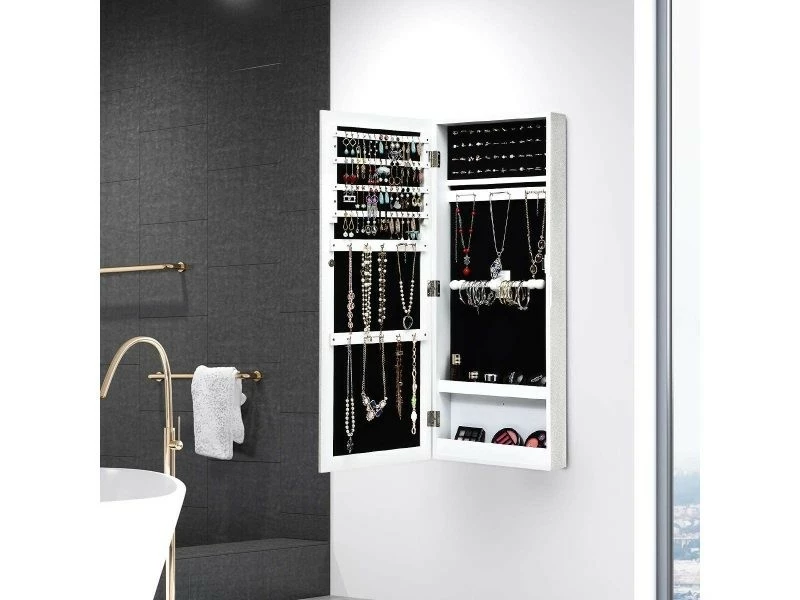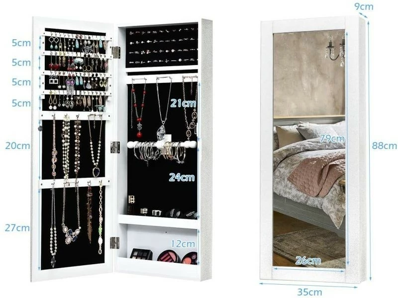 - Économiser de l’espace au sol : L’armoire à bijou est montées sur un mur, exploitant pleinement l’espace mural, économisant de l’espace au sol et n’affectant pas votre espace de vie. L’extérieur est un miroir qui peut être utilisé pour ranger des vêtements, tandis que l’intérieur sert à ranger des boucles d’oreilles, des bagues, des colliers ainsi que d’autres bijoux et cosmétiques.