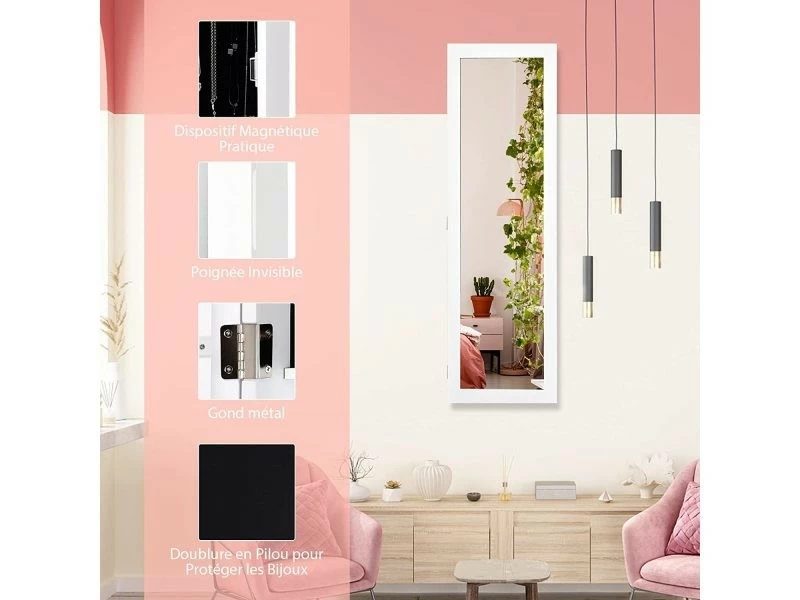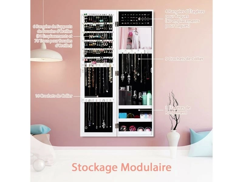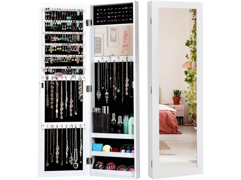 - Armoire à bijoux multifonctionnelle: Notre armoire à bijoux est composée d’un miroir et d’une armoire, ainsi, elle vous offre beaucoup d’espace pour ranger vos bijoux tout en vous permettant de profiter du plaisir de vous habiller. Vous pouvez utiliser le miroir pour votre tenue ou porter des boucles d’oreilles et des colliers.