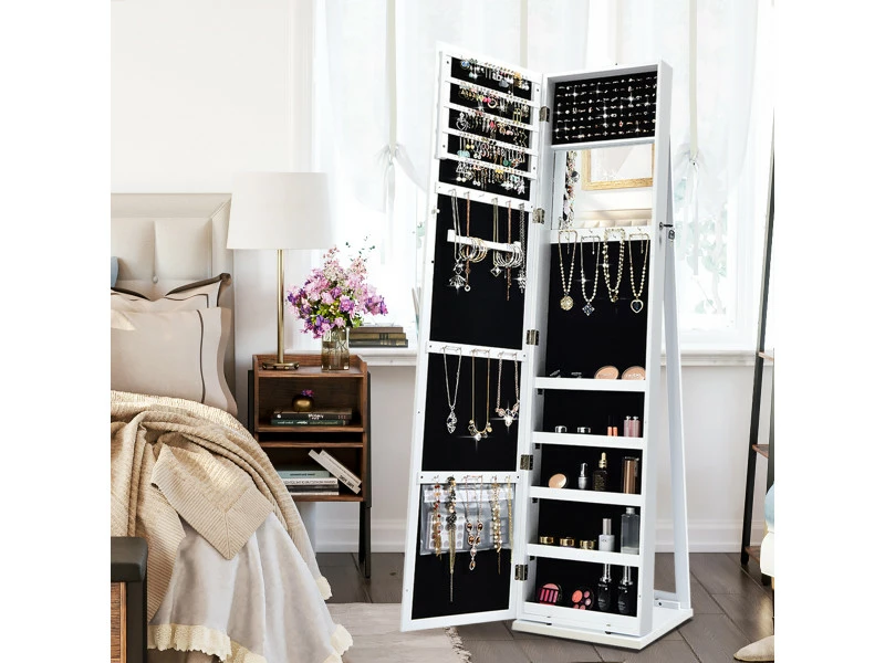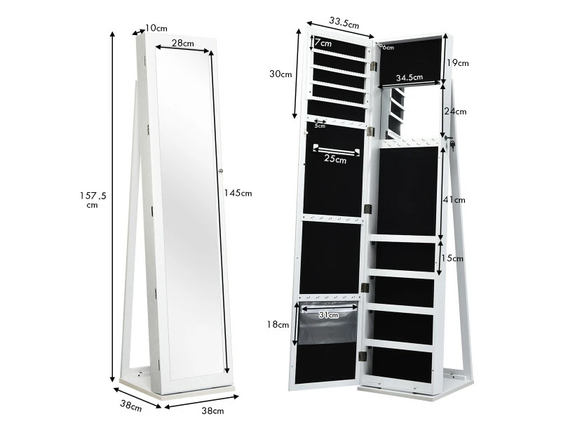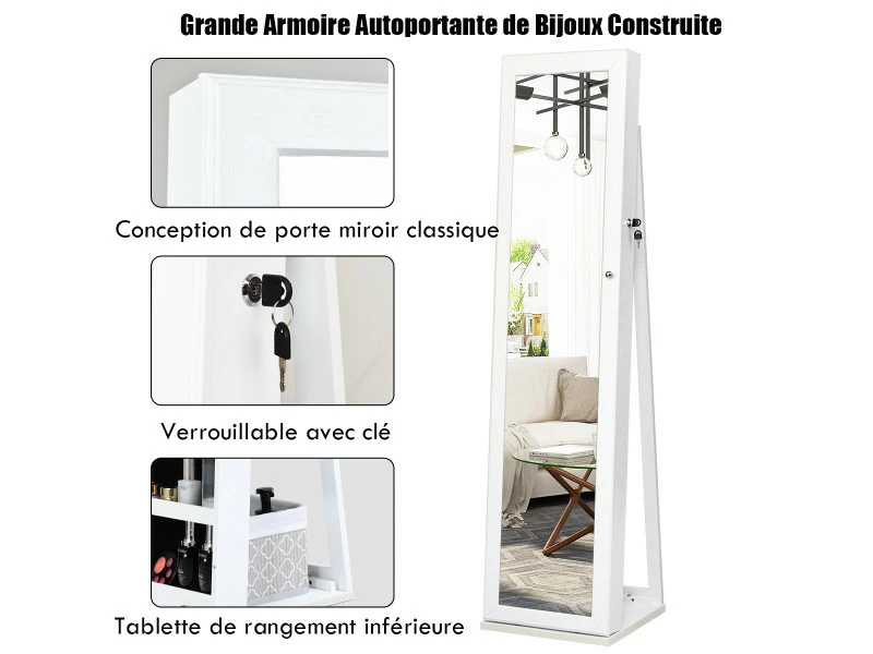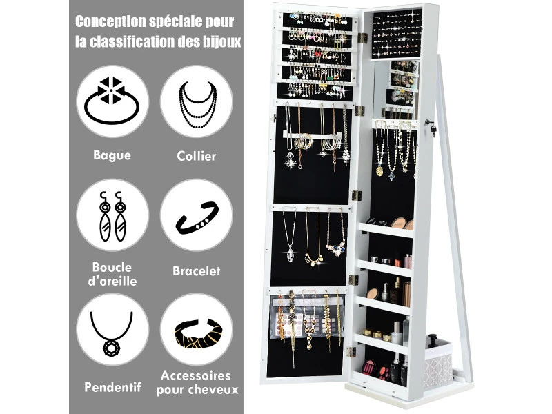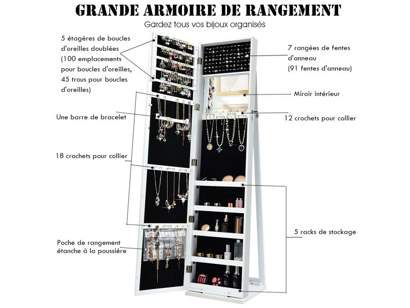 Notre armoire à bijoux est parfaite pour toutes les femmes avec de belles collections de bijoux. Cette armoire élégante gardera tous vos bijoux en sécurité au même endroit. Avec sa capacité de rangement large grâce à ses 100 places pour boucles d’oreilles, 45 trous pour boucles d’oreille, 91 espaces pour bagues, 30 crochets pour collier, 5 étagère de stockage, vous pouvez y ranger l’ensemble de votre collection. Grâce à la serrure de verrouillage vous aidera à les garder en sécurité. Le miroir plein pieds vous offre une vue des pieds à la tête pour choisir vos tenues. Fabriqué en MDF durable, cette armoire sur pieds assure un utilisation long terme. Grâce à son apparence, cette armoire à bijoux rendra votre chambre élégante et sophistiquée