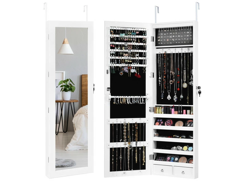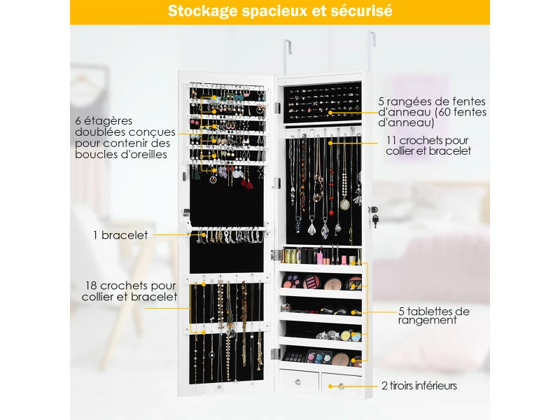 【Espace de stockage :】 il est utile que vos bijoux soient bien rangés afin que vous puissiez les retrouver plus facilement chaque jour. L’intérieur de l’armoire comprend 6 étagères doublées pour tenir les boucles d’oreilles et les clous, 29 crochets pour colliers, 60 emplacements pour anneaux, 1 tringle pour écharpe, 5 étagères pour les cosmétiques, du vernis à ongles et 2 tiroirs inférieurs pour vos objets de valeur.