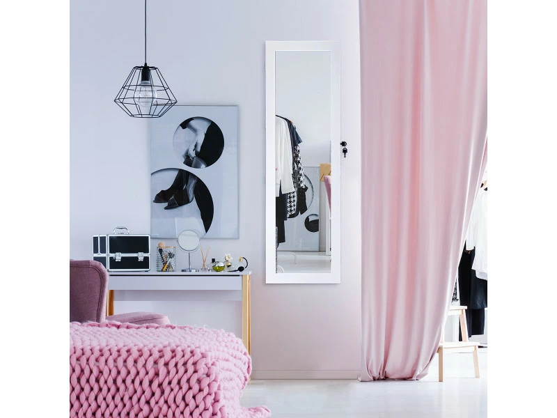 Cette armoire pour bijoux est la solution idéale pour économiser de l’espace et organiser tous vos bijoux. Vous pouvez l’accrocher au mur ou au-dessus d’une porte afin de libérer de l’espace sur votre meuble de salle de bain. Il possède de nombreuses fentes pour boucles d’oreilles, des porte-bagues et des crochets pour colliers et bracelets, qui permettent de garder tous vos bijoux au même endroit et de les empêcher de s’emmêler. Le miroir en verre sur toute la longueur reflète l’image réelle sans effet et offre à la perfection une vue de la tête aux pieds de votre tenue. Il y a des lumières LED à l’intérieur qui facilitent la recherche d’objets la nuit ou tôt le matin. Équipé d’un verrou latéral, cet organisateur de bijoux peut garder vos bijoux bien-aimés à l’écart des enfants. Vous n’aurez plus à vous soucier de perdre vos bijoux et de vous débrouiller avec cette armoire à bijoux verrouillable.