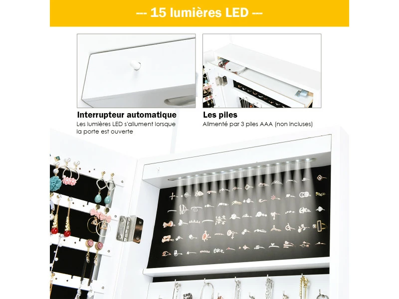【Allumage / extinction automatique des voyants :】les voyants s’allument lorsque la porte est ouverte. Ils permettent d’éclairer correctement vos bijoux et facilitent la recherche d’objets le soir ou tôt le matin. Sous la douce lueur, vos bijoux sont plus brillants et vous pouvez voir clairement quels bijoux vous conviennent pour le moment. (Les lumières LED sont alimentées par 3 piles AAA, non incluses).