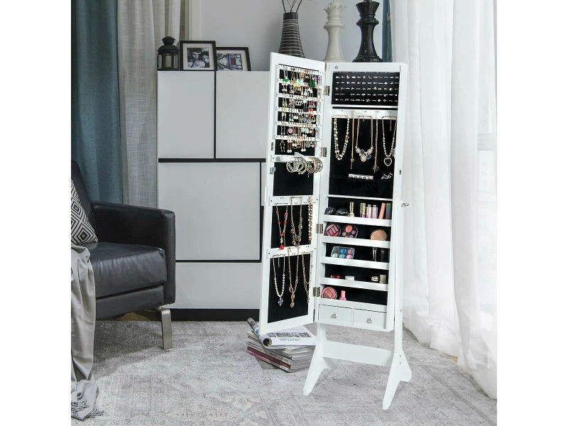 Notre armoire à bijoux LED avec serrure est une pièce d’art indispensable dans votre maison. Elle est conçue pour tous vos objets de valeur et son espace de rangement permet de ranger différents bijoux dans différents emplacements. Des lumières LED sont installées à l’intérieur de l’armoire pour vous aider à trouver les bijoux que vous voulez dans un environnement sombre. Une porte à clé vous assure que vos bijoux sont en sécurité et à l’abri des enfants. Un miroir grand format vous permet d’essayer aisément vêtements et bijoux. N’hésitez pas ! Notre armoire à bijoux est ce que vous cherchez.