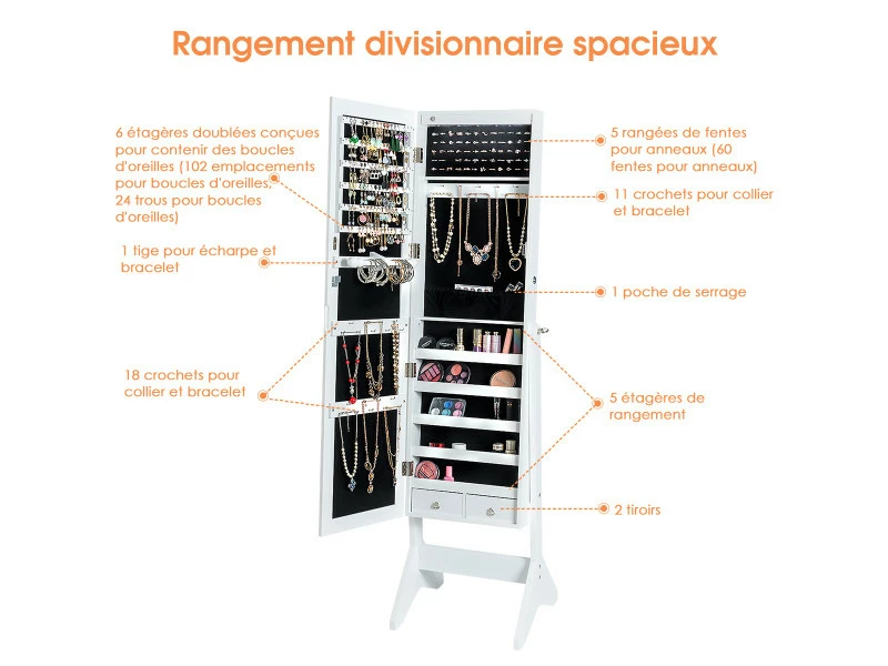 【Rangement compartimenté et porte à serrure :】l’armoire à bijoux comprend 5 étagères, des fentes pour boucles d’oreilles et bagues, des crochets pour colliers, une barre pour foulards, une pochette et 2 tiroirs. Divers bijoux y trouvent leur place et sont parfaitement rangés. La porte avec serrure permet de les garder en toute sécurité.