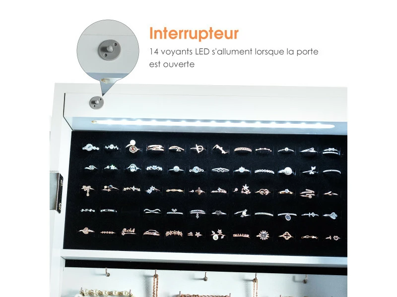【Bande lumineuse LED intégrée :】une rangée de lumières LED est montée sur le dessus de l’armoire à bijoux. Lorsque la porte est ouverte, les lumières s’allument automatiquement, vous permettant ainsi de trouver facilement les bijoux que vous désirez, même dans l’obscurité.