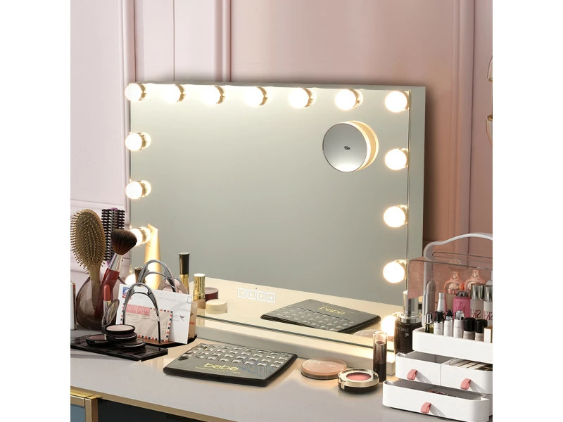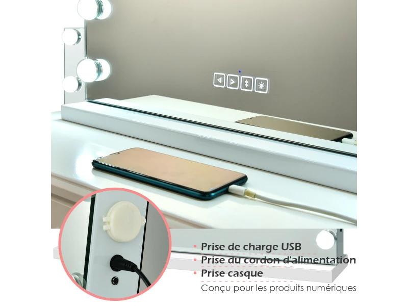 Vous aimez le maquillage? Vous voulez vous habiller avec soin tous les jours et être d’humeur joyeuse? Vous ne pouvez passer à côté de notre miroir! Ce miroir de coiffeuse avec lumières vous offre une meilleure vue de votre visage ou de votre corps. Entouré de tant d’ampoules, il recréera l’environnement de lumière naturelle selon vos besoins pour un maquillage parfait. Plus encore, vous pourrez connecter votre téléphone avec le port USB côté miroir pour lire de la musique.