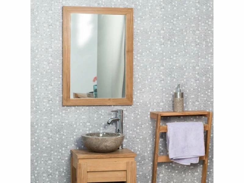 Naturel et sobre ce miroir en bois massif teck rectangulaire s’intègrera parfaitement dans votre salle de bain. La simplicité et l’élégance de cet accessoire déco offrent à votre salle d’eau un espace à l’atmosphère chaleureuse. Son cadre en bois massif teck naturellement résistant à l’humidité vous séduira de par son authenticité. Il trouvera idéalement sa place au dessus de l’un de nos meubles de salle de bain. Par exemple suspendu au-dessus du meuble en bois simple vasque zen 40. Dimensions miroir Largeur : 50 cm Epaisseur : 3 cm Hauteur : 70 cm