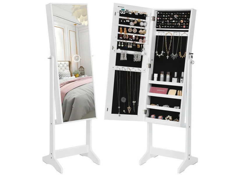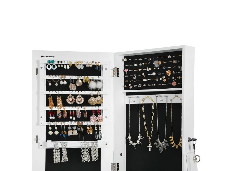 Attendez ! Il manque encore quelque chose. Choisissez une paire de boucles d’oreilles et un collier pour compléter votre tenue. Heureusement, vous n’avez pas besoin de les chercher partout, car ils sont tous rangés soigneusement dans cette armoire à bijoux avec miroir.