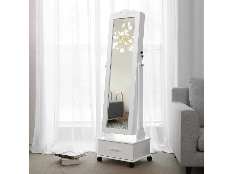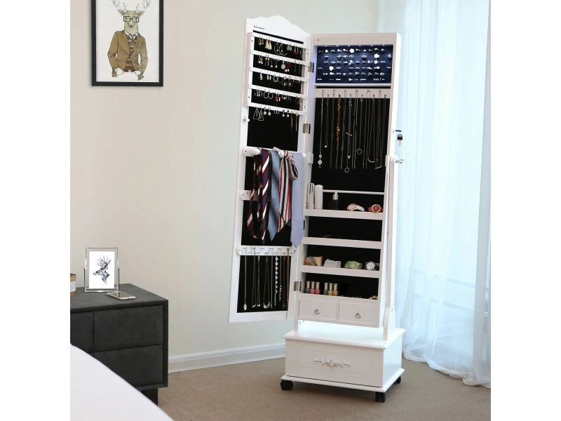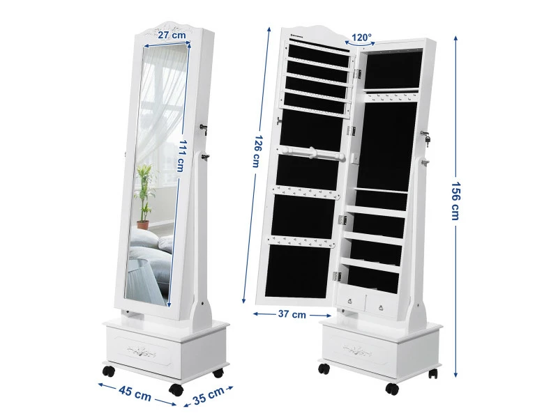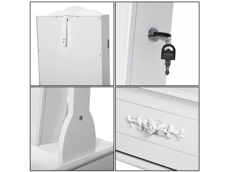 Cette armoire à bijoux, qui combine à la fois une psyché et une armoire de rangement ensemble, est un produit idéal et fiable pour ranger vos accessoires de beauté et pour vous maquiller. Tous les détails de ce produit sont traités avec soins. Les 4 roulettes pivotantes assurent un déplacement facile. Pour faciliter le montage, une notice de montage illustrée est fournie. Nous veillons minutieusement sur la satisfaction de notre client en prenant soin de la qualité et de l’emballage dans le but d’assurer l’arrivée intact du produit.